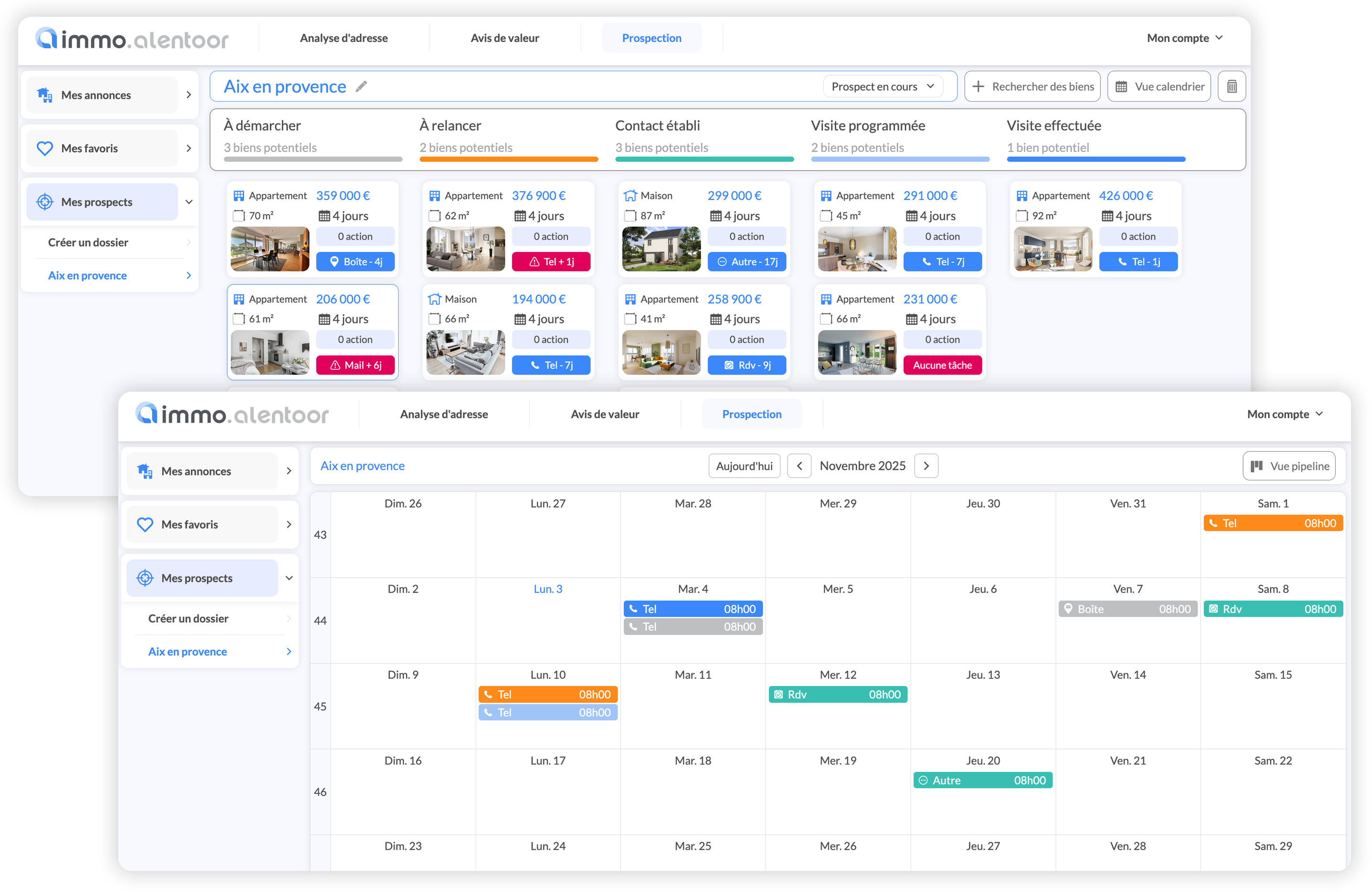 Déplacez vos prospects dans votre pipeline d'activité selon leur statut — à contacter, à relancer, visite effectuée, jusqu'au bien vendu — et planifiez vos relances dans un calendrier intelligent.